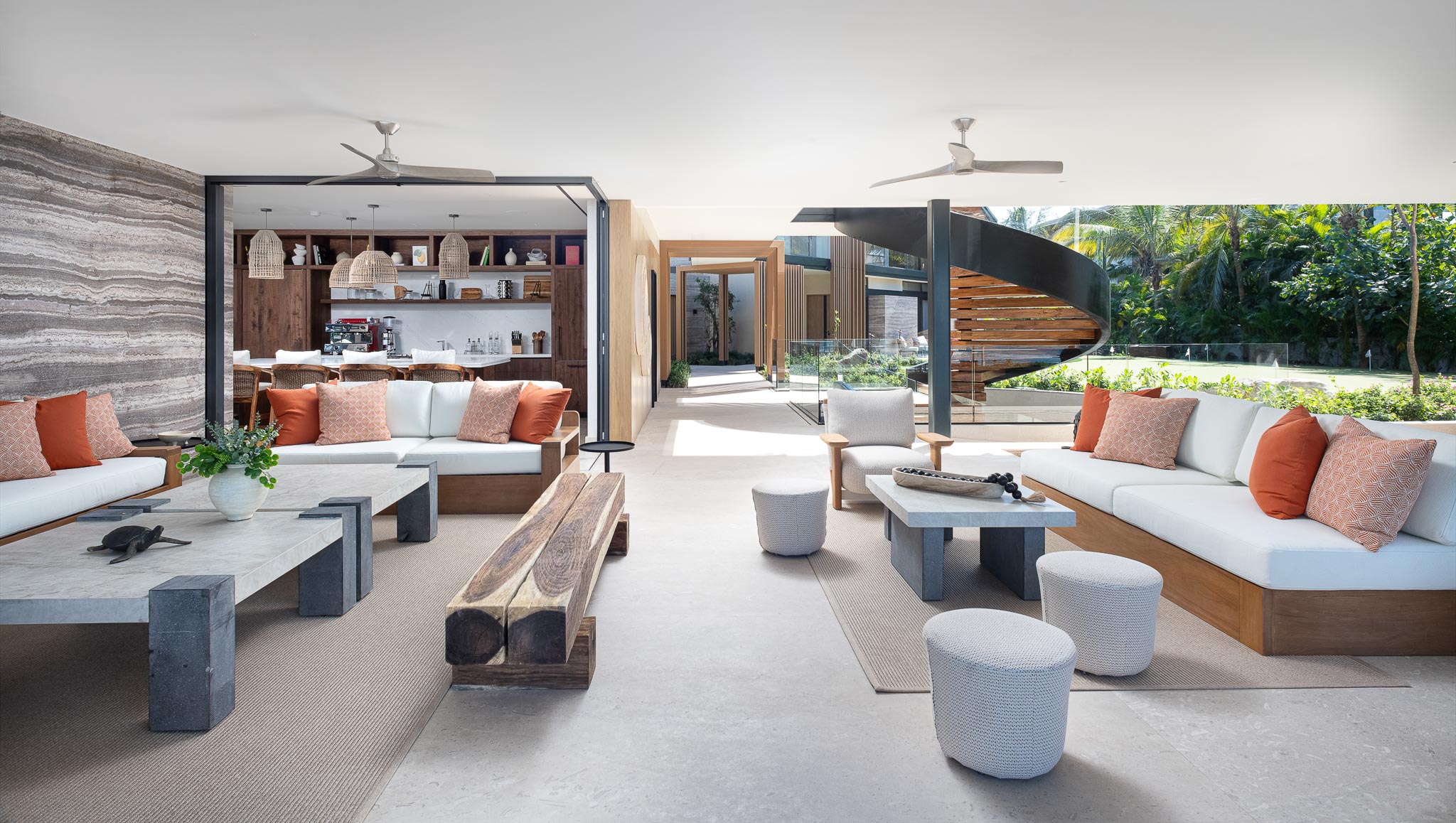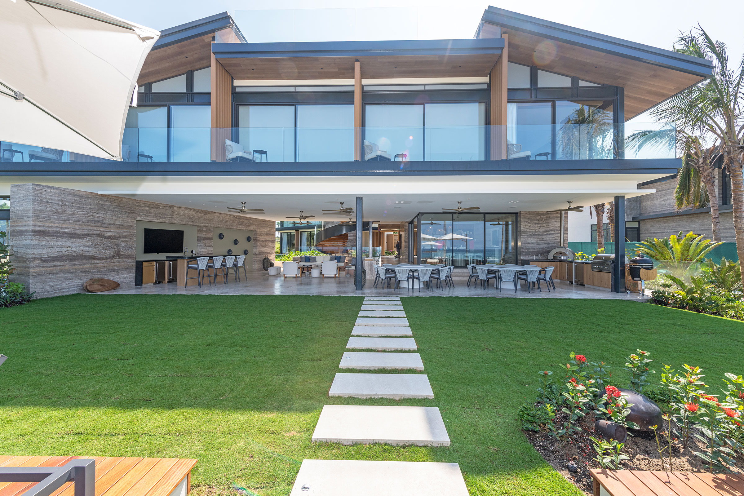 • Expansive indoor and outdoor living spaces include al fresco dining areas, fire pit lounges, and sprawling terraces.