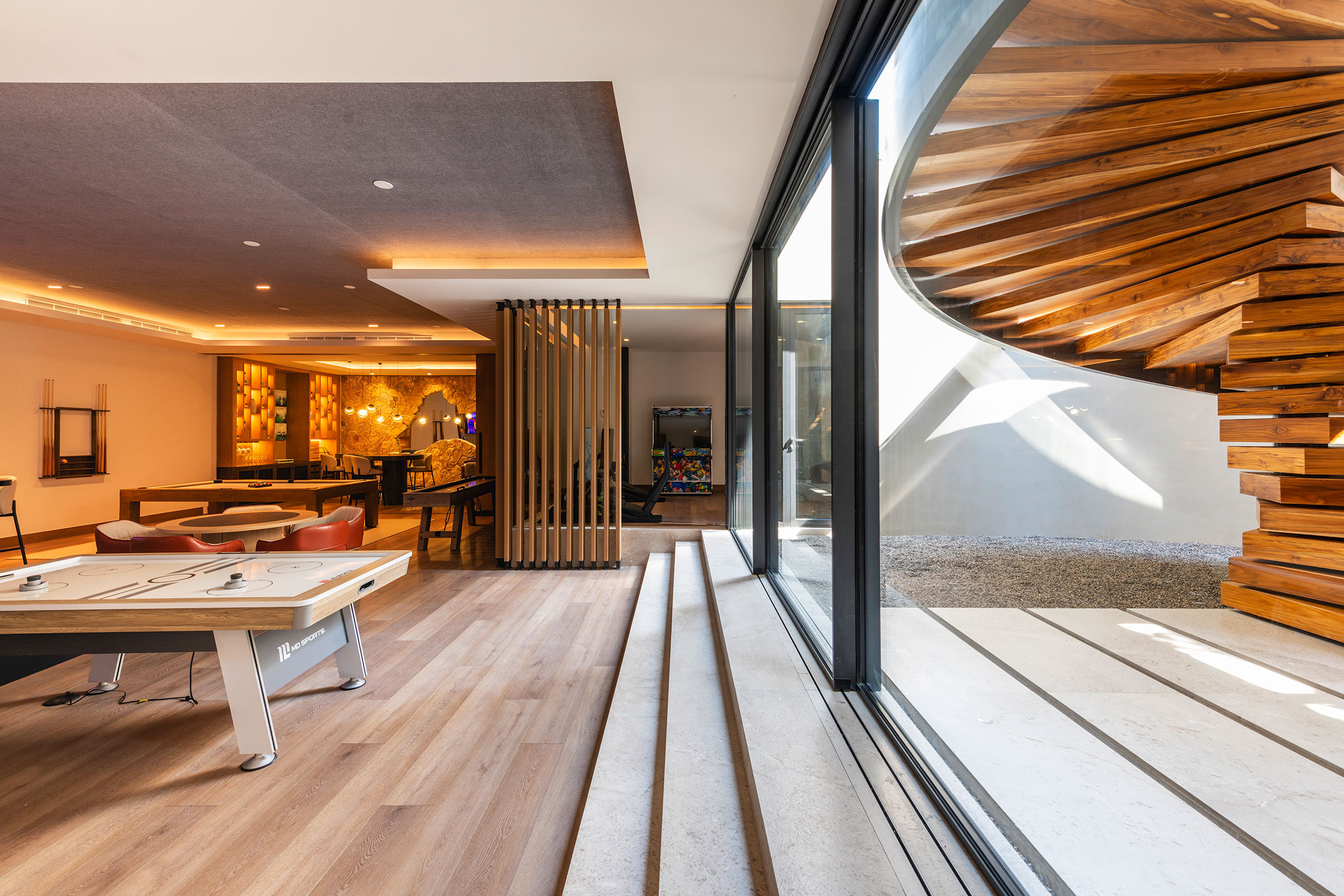 Two infinity pools, private spa, gym, and entertainment spaces for relaxation and fun.