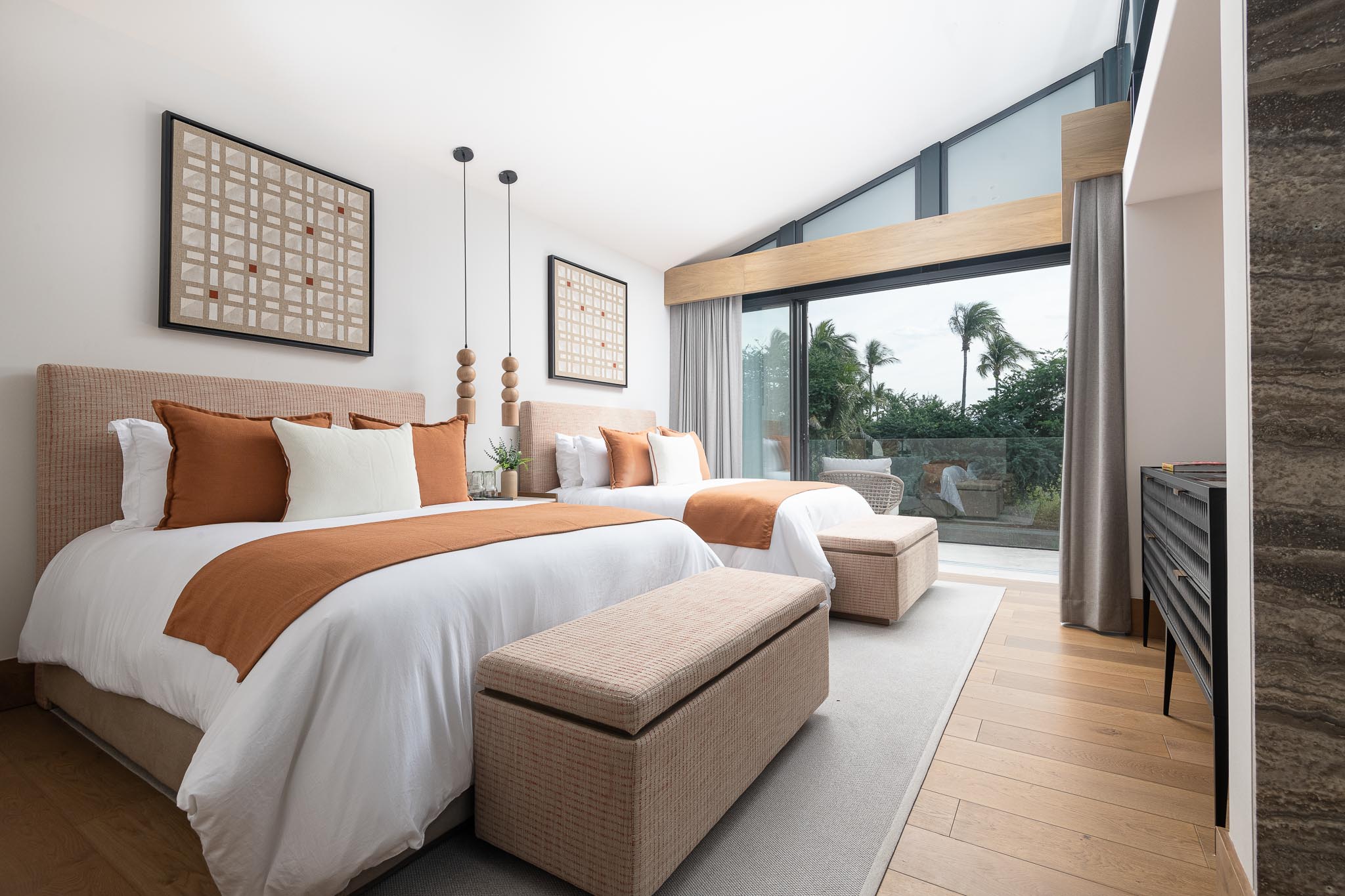 Albriet and Angel from Villa Experience Team relaxes at sunset on a Pacifico Estate couch, Punta Mita, surrounded by palm trees and sea views.