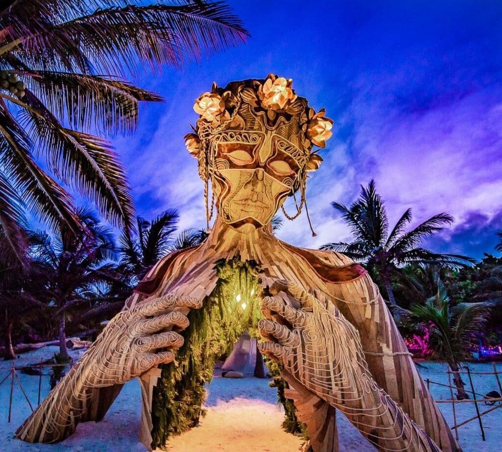 A 10-minute drive separates the town from the beach and renting a bike, or a moped is a fun way to get there if you don’t have a car at your disposal. Luxurious hotels, luxury villas, and lively beach clubs await you to experience something unique. If you’re starting your day early, you could stop by the famous “Ven a la Vida” sculpture at the Ahau Hotel entrance before taking a deliciously healthy breakfast at Fresco’s Restaurant. You could take a yoga class in private or in one of the many hotels that offer them and then take a trip to one of the many cenotes around the area to enjoy them before it gets crowded.